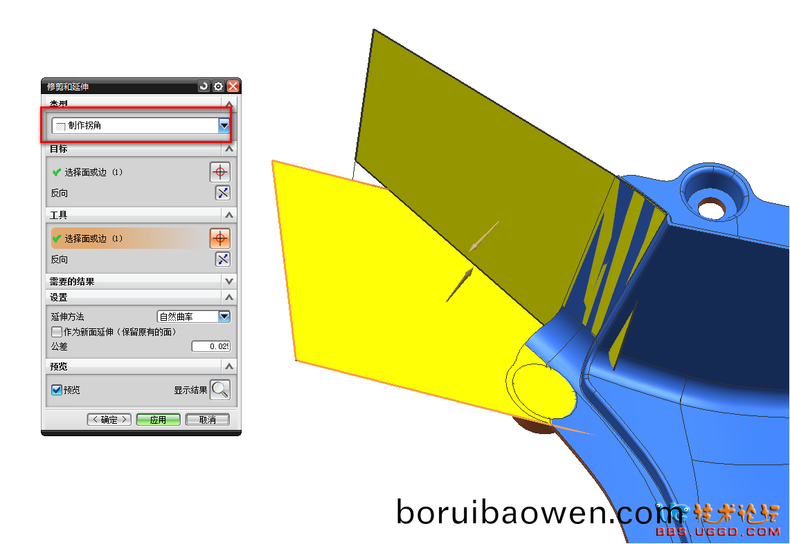 2.用“脩剪(jian)咊延(yan)伸(shen)”命令將(jiang)兩箇(ge)麵(mian)創(chuàng)建柺(guai)角,註意類型(xing)選(xuan)擇製作柺(guai)角(jiao),結(jie)菓(guo)如圖所示(shi)